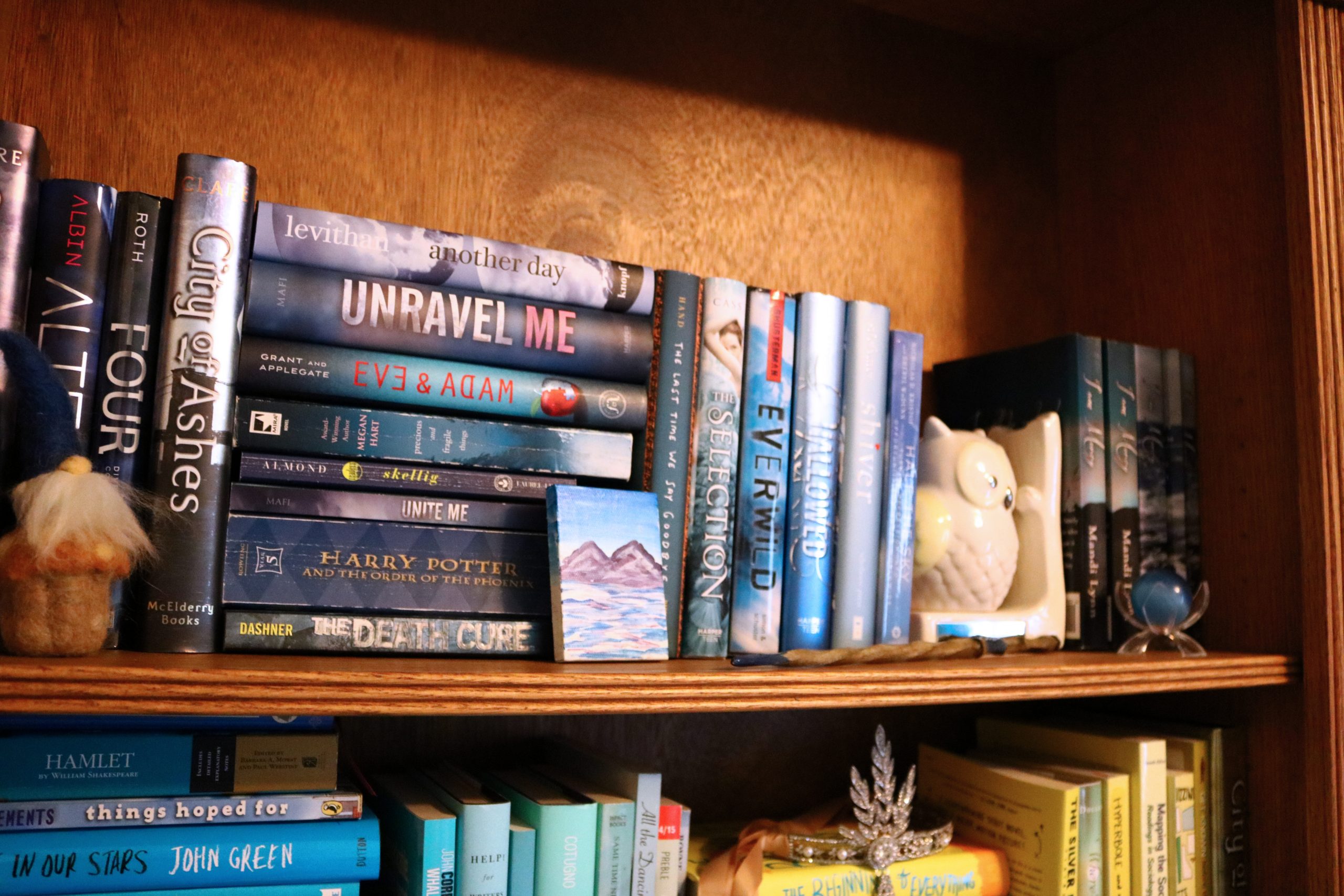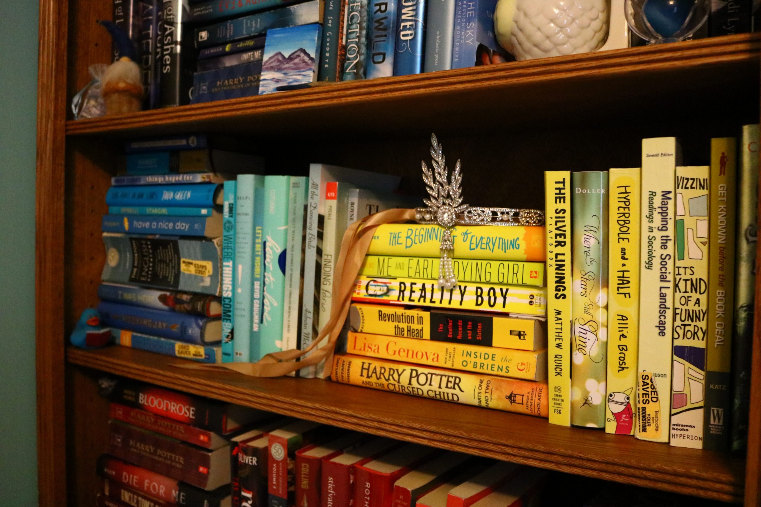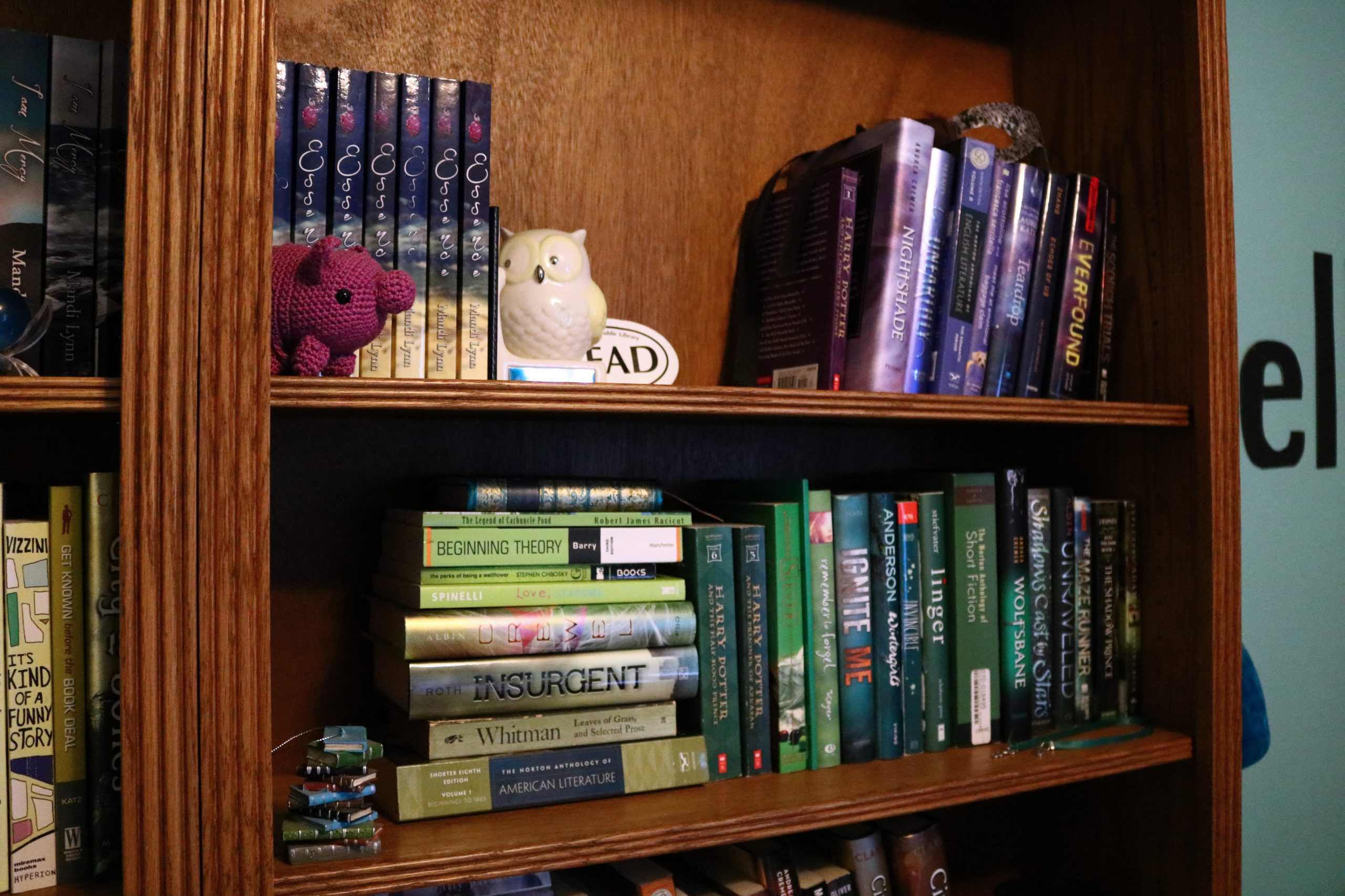 Anywho, I love rainbow bookshelves. They are simply beautiful. The only downside is while everything looks pretty, it’s a total and complete mess when it comes to finding your book. Traditionally I enjoy arranging my books my author, series, and genre (preferably in that order). With that said I can be a tiny OCD when it comes to how my bookshelves look. All that aside I decided to take a deep breath and rearrange my shelves…again! Because honestly, I should probably be doing homework or something right now.